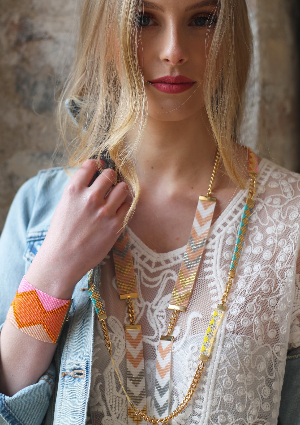 The necklace is woven by Sadie using traditional bead loom techniques, high quality seed beads and a Shh by Sadie pattern. Finished with 24 carat gold plated clamps, gold chain and signature Shh by Sadie tag.