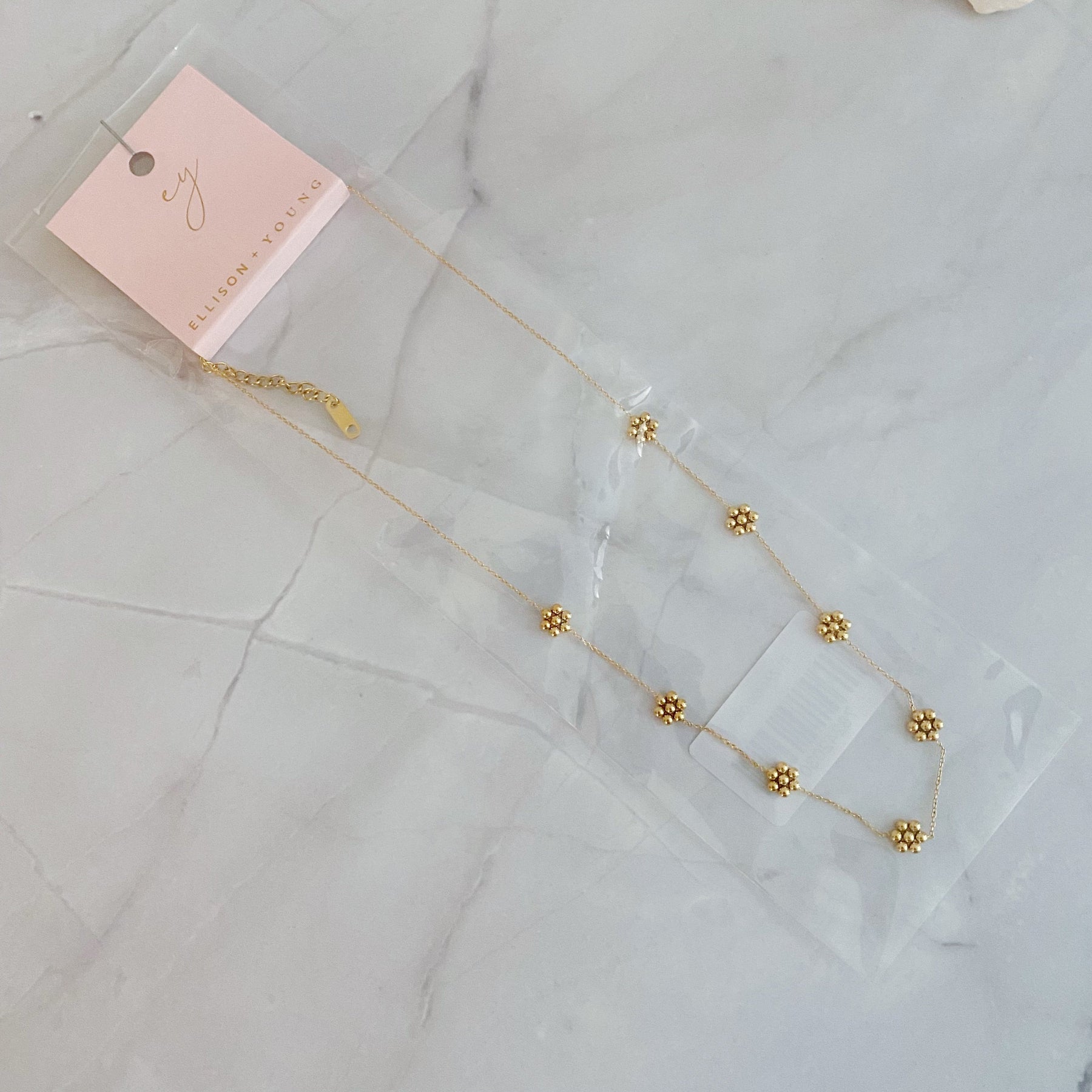 This Dainty Golden Bead Flower Necklace features tiny ball bead flowers with a dainty chain, creating an elegant and eye-catching look. Perfect for any occasion, this necklace is easy to dress up or down. It's beautiful to wear it alone or a great layering piece to complete your outfit.